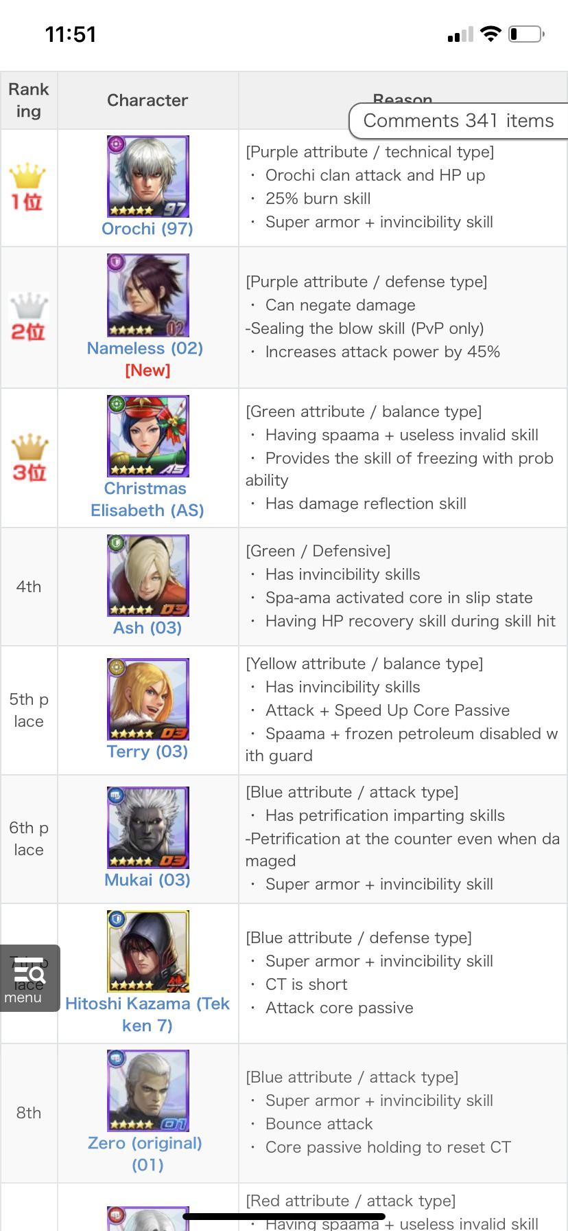 Top 10 Character Ranking From Jp Server The King Of Fighters
